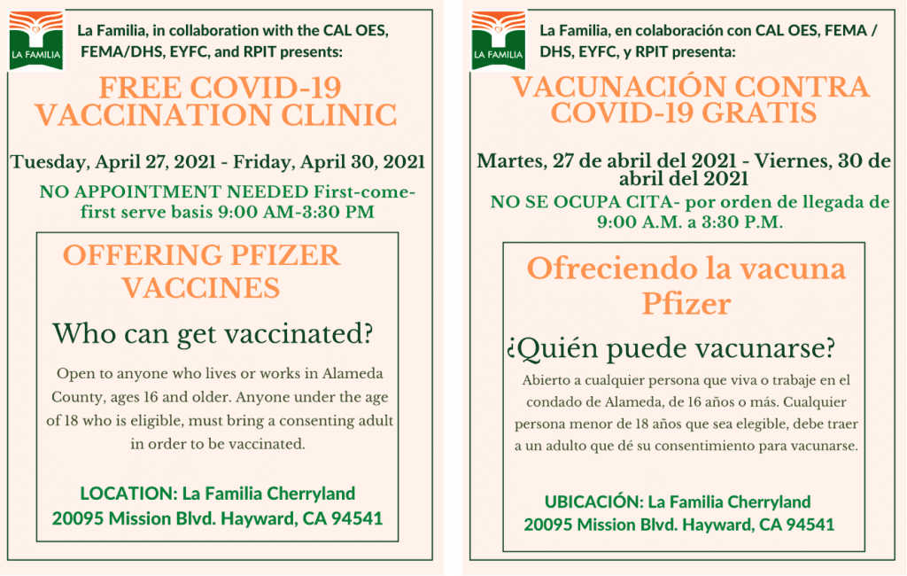 This clinic is FREE and open to all community members who work or live in Alameda County ages 16 and older. Any eligible recipient under 16yrs must bring a consenting adult in order to be vaccinated. This operation will only be available through Friday April 30 and will be offering the Pfizer vaccine. La Familia is asking the community to share this vital information with all of their networks and social circles so that we can continue to bring Alameda County closer to being fully vaccinated and keep our communities safe from COVID-19. See/share the flyer below for full details: